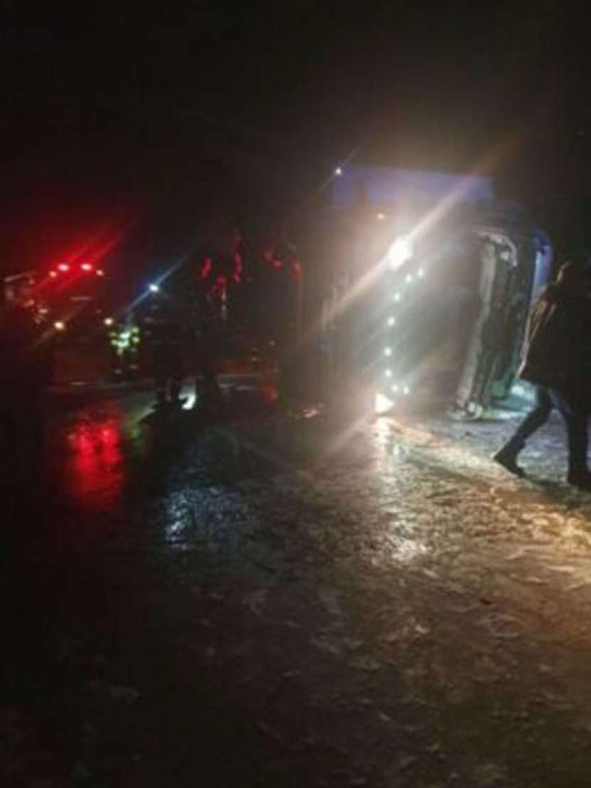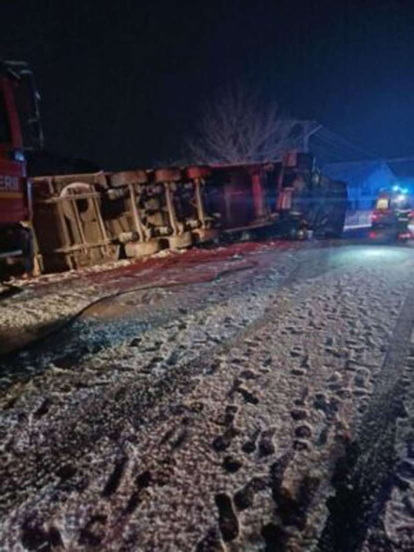 Conform vasiledale.ro, se pare că șoferul unui autotren nu a adaptat viteza la condițiile unui carosabil acoperit de zăpadă, a pierdut controlul volanului într-o curbă și s-a răsturnat în stânga direcției de mers.