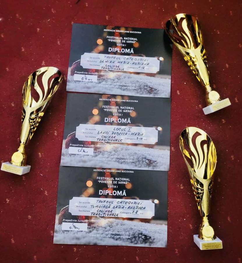 Astfel, eleva Daria Tomoiaga a obținut Trofeul categoriei COLINDE TRADIȚIONALE, categoria de vârsta 7-8 ani. eleva Adriana Demian a venit cu Trofeul categoriei COLINDE TRADIȚIONALE, categoria de vârsta 11-12 ani și eleva Rebeca Danci a obținut Premiul 1 la categoria de vârsta 9-10 ani.
