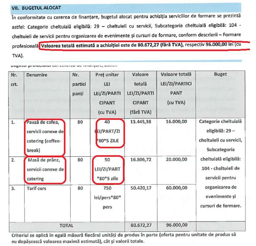 Valoarea totală a investiției (masă + tratații +curs de formare) este de 96.000 lei (tva inclus)